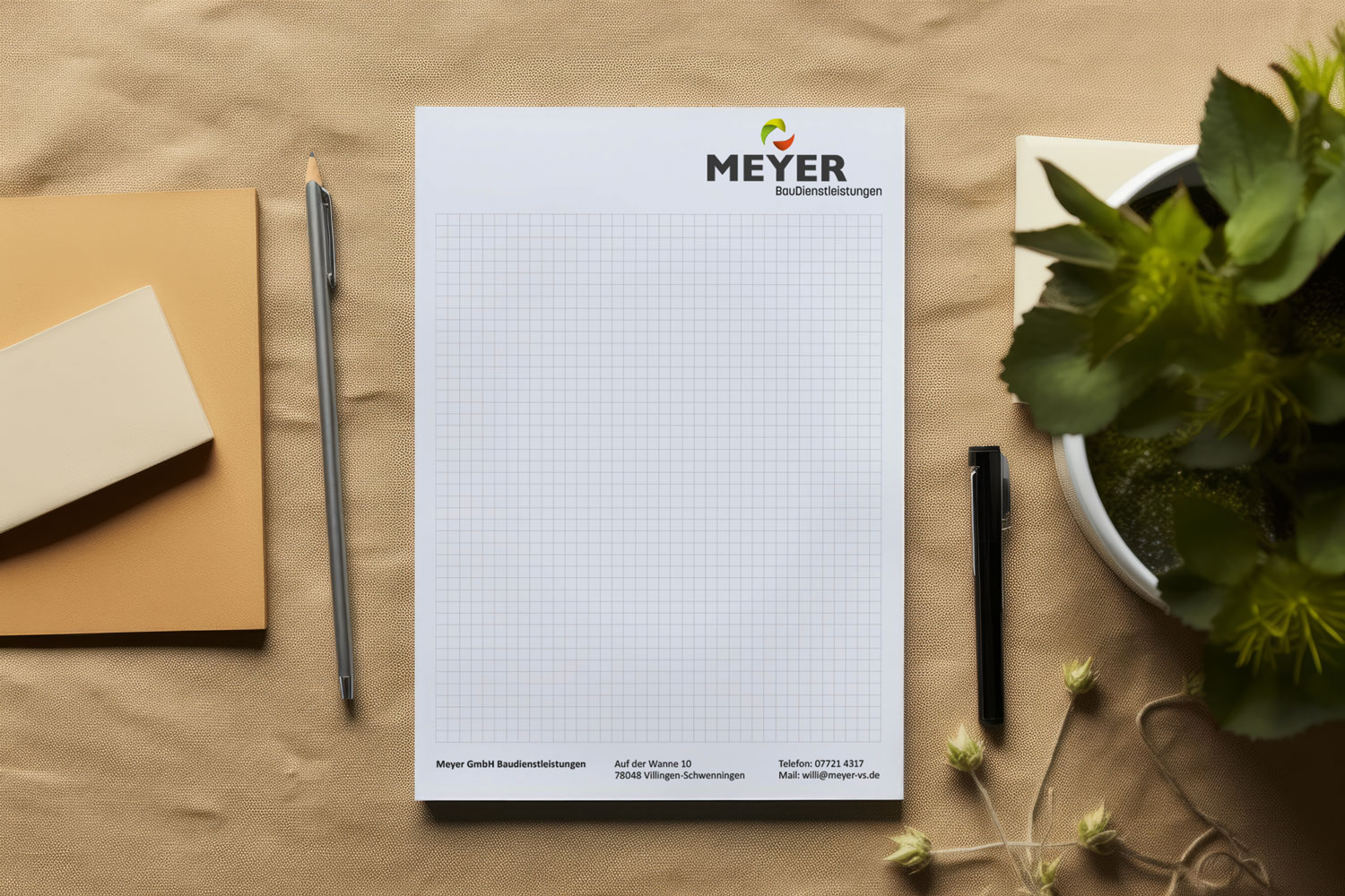 Ob Infoflyer, Geschäftsausstattung oder Werbemittel – wir sorgen für ein einheitliches Erscheinungsbild, das Professionalität und Bodenständigkeit verbindet. So entsteht ein Auftritt, der hält, was er verspricht – genau wie die Arbeit von Meyer GmbH auf der Baustelle.